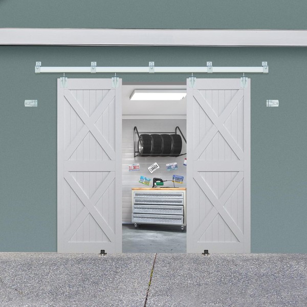 Exterior Barn Door Hardware Kit, BARNSMITH 8FT Sliding Barn Door Hardware Heavy Duty Doors Track Kit for Double Doors Use, Wall Mount, Silver (Hardware Only)