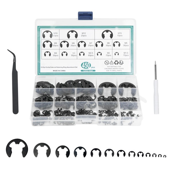- 【Package Included】Manganese Steel E-Clip package contains 450pcs snap ring kits. M15, M12, M10, M9, M8, M7, M6, M5, M4, M3, M2.5, M2, M1.5, 13 sizes, also comes with 1pc screwdriver and 1pc tweezers, plus 1pc plastic case, Stainless Steel E-Clip meets the needs of multiple uses.