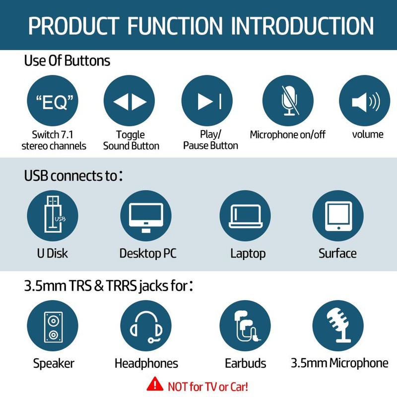 - Compatibility: compatible with all popular systems, including Windows XP, 7, 8, 8.1, 10, Mac iOS, etc. At the same time, you can connect multiple USB devices or 3.5 mm interfaces to PC, laptop, PS4, Xbox One, etc., such as keyboard, mouse, card reader, webcam, MP3 player, phone, microphone, etc.