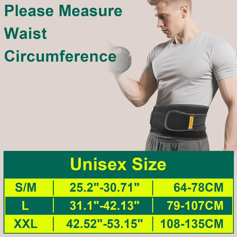 - [Choose the Right Size] Our back brace belt fits both men and women. Please make sure you measure circumference around the navel when choosing the right size. Also DO NOT use your pant size as reference. S/M fits 64-78cm(25.2"-30.71"); L/XL fits 79-107 cm(31.1"-39.76"); XXL fits 108-135cm(42.52"-53.15")