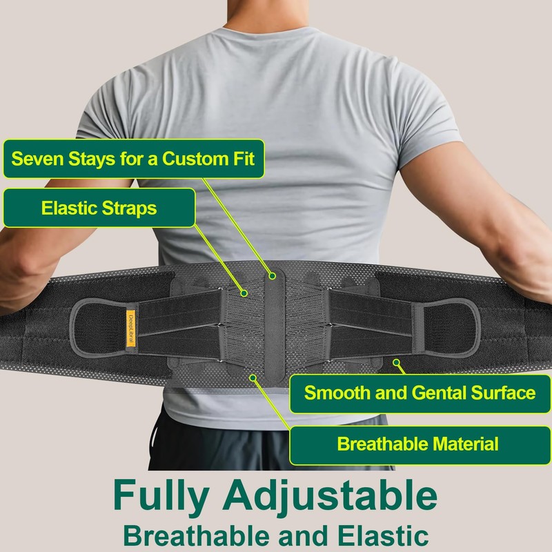 - [Forget about Pain] Our back brace provides immediate and lasting relief from conditions such as herniated discs, sciatica, back pain, sore muscles, compressed discs, lordosis, and other chronic lower back issues. Whether you're walking, bending, or stretching, wearing it helps improve mobility and reduces the need for pain medication. More importantly, this unisex back support brace features 7 support stays that offer cushioning and compression to the lower back. Say goodbye to pain and hello to the freedom of movement!