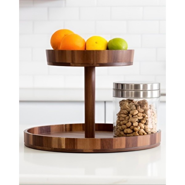 Extra Large 2-Tier Acacia Wood Lazy Susan, 15 Inch Round Serving Tray, Modern Kitchen Organizer