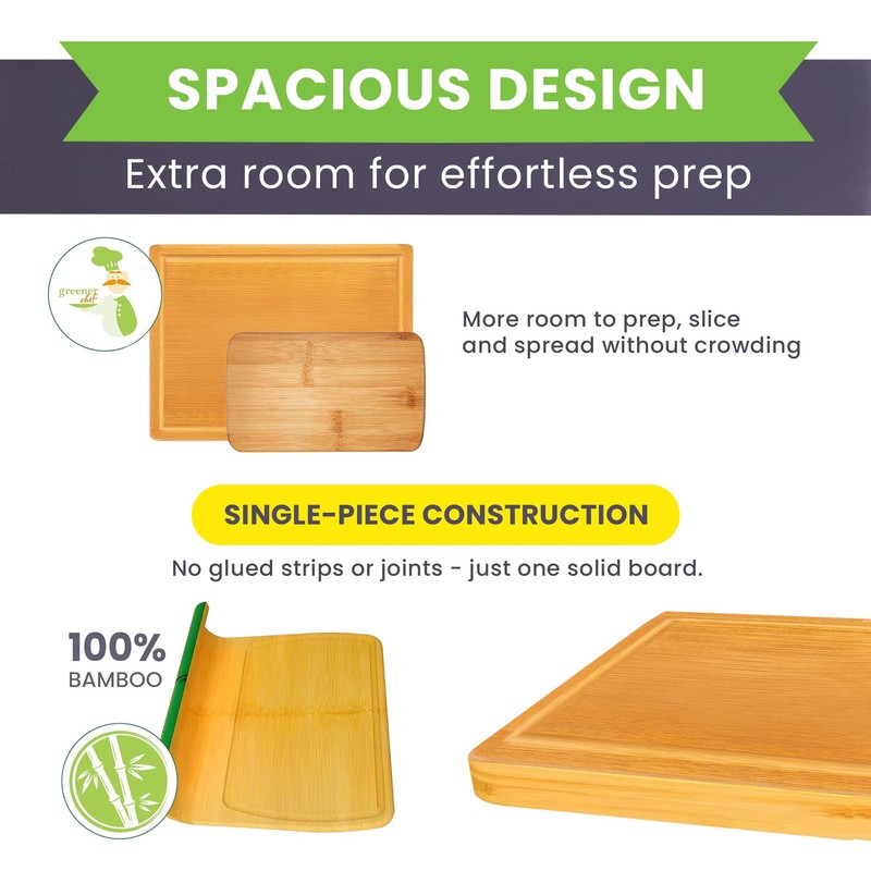 - PATENT-PENDING GLUE-FREE SURFACE – Crafted from single sheets of bamboo, our XL cutting boards contain no adhesives, no chemicals, and no toxins on food-contact areas - making them the safest chopping boards for family kitchens.