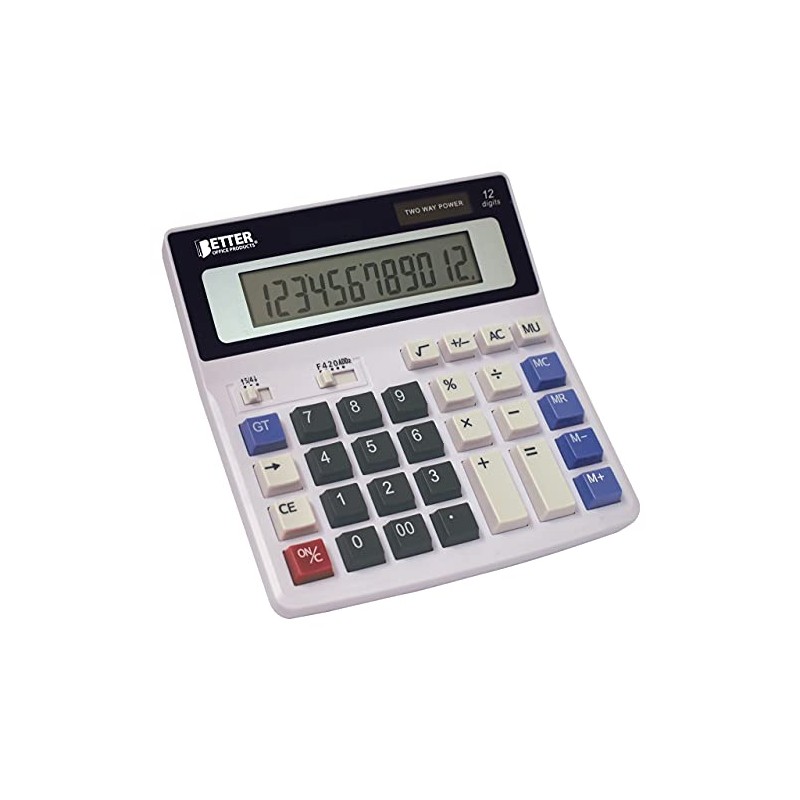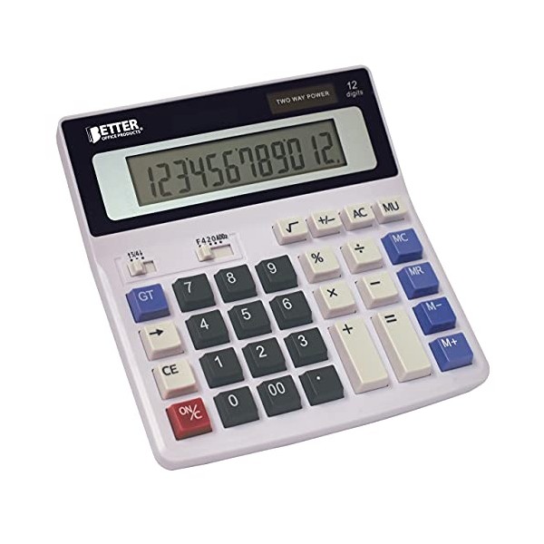 Extra Large Electronic Desktop Calculator, 12-Digit LCD Display, Angled Display Panel, by Better Office Products, 4 Function Memory Keys, Light Gray, Dual Power with Included AA Battery Power