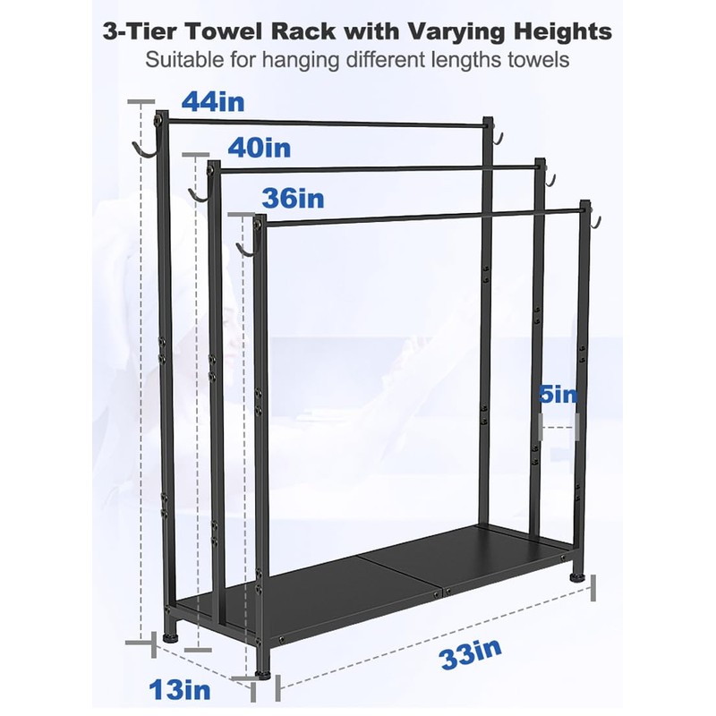 AnBaiMei Extra Large Free Standing Towel Rack with Metal Storage Shelf & 6 Hooks for Bathroom, 3 Tiers Heavy Duty Blanket Drying Stand Holder for Outdoor Pool, Bedroom, Living Room, Black