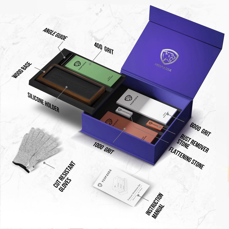 Extra Large Knife Sharpening Stone Kit - YeopAsda Thickered 3 Side Grit 400/1000/6000 Xl Wet Stone - Whetstone Knife Sharpener with Non-Slip Wood Base, Angle Guide, Cut Resistant Gloves