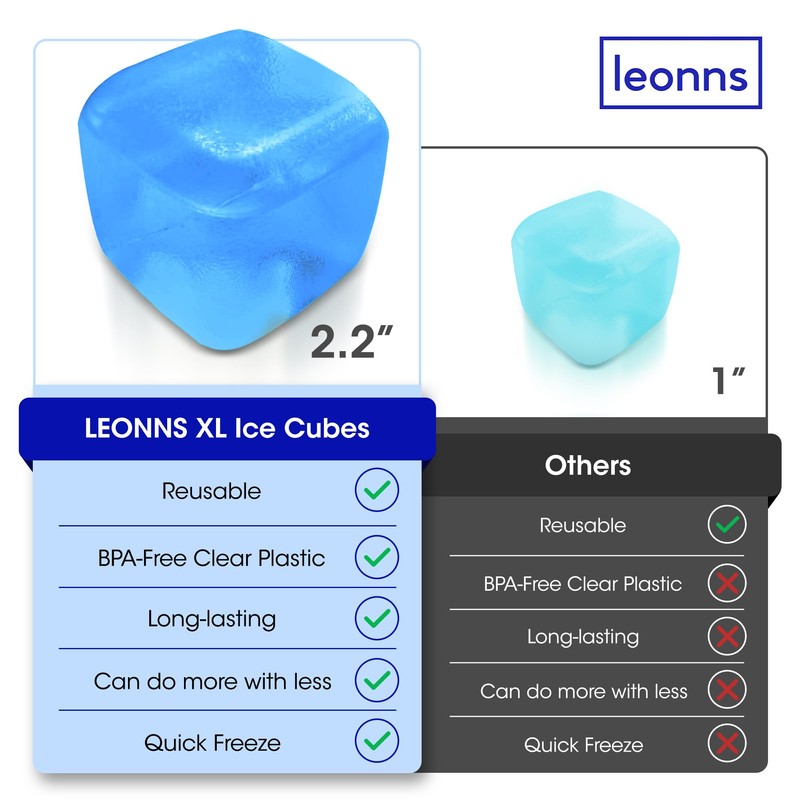 - XL MEANS MORE ICE: Unlike typical 1-inch reusable ice cubes that melt quickly, our 2.2-inch freezer cubes last longer, making them ideal for large containers, pitchers, and cold therapy units.