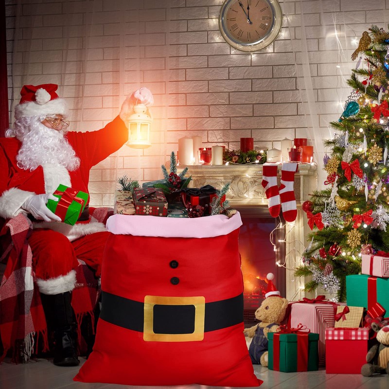 - Classic Christmas Design: our Christmas gift sack has a classic Santa design, the red bag is painted with Santa's gold belt and 2 black buttons, good for Christmas decorations; Place this Santa extra large bag under the Christmas tree can add more Christmas atmosphere to your home