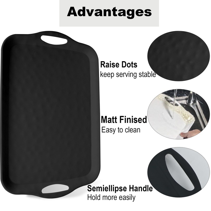 Extra Large Serving Tray with Handles, 20x13 inch, Set of 2 Melamine Platters for Serving Food, Turkey, Cookie, Rectangular Trays for Eating, Raised Dots Matt Finished, Dishwasher Safe, Black