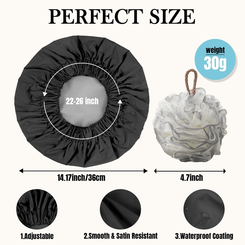 - 【Stylish Black Shower Cap】– Waterproof reusable shower cap crafted from ultra-soft, eco-friendly polyester with a white bottom inner coating. This cute shower cap for long hair, braids, or voluminous styles, it blocks water, dust, and odors while keeping hair dry and tidy during showers, spa days, or skincare routines.