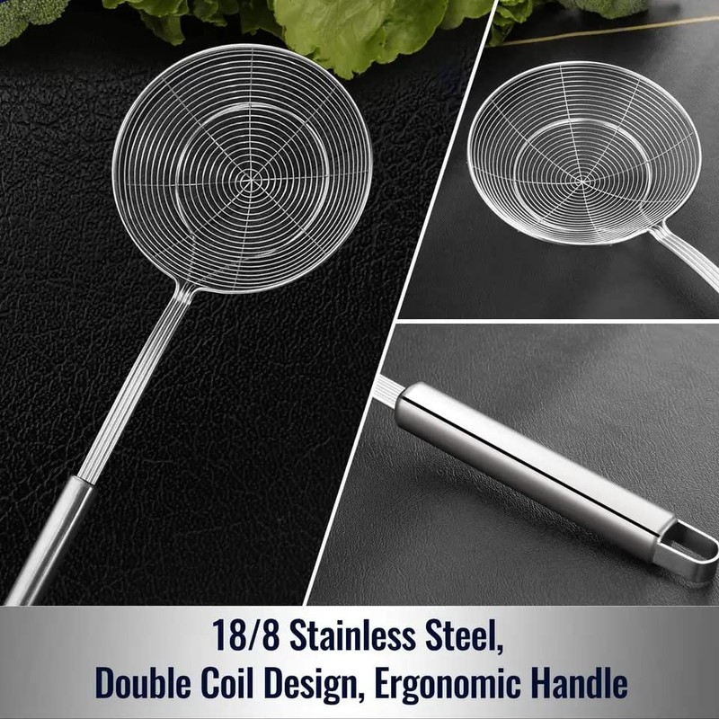 - STRONG & PREMIUM STAINLESS STEEL CONSTRUCTION - high quality Premium stainless steel, net wiring and sturdy outer framework and handle, won't be deformed even after long-term-use. – Skim and strain food such as noodles, pasta, french fries, meats, fish, boiled eggs, potatoes, chickpeas and more