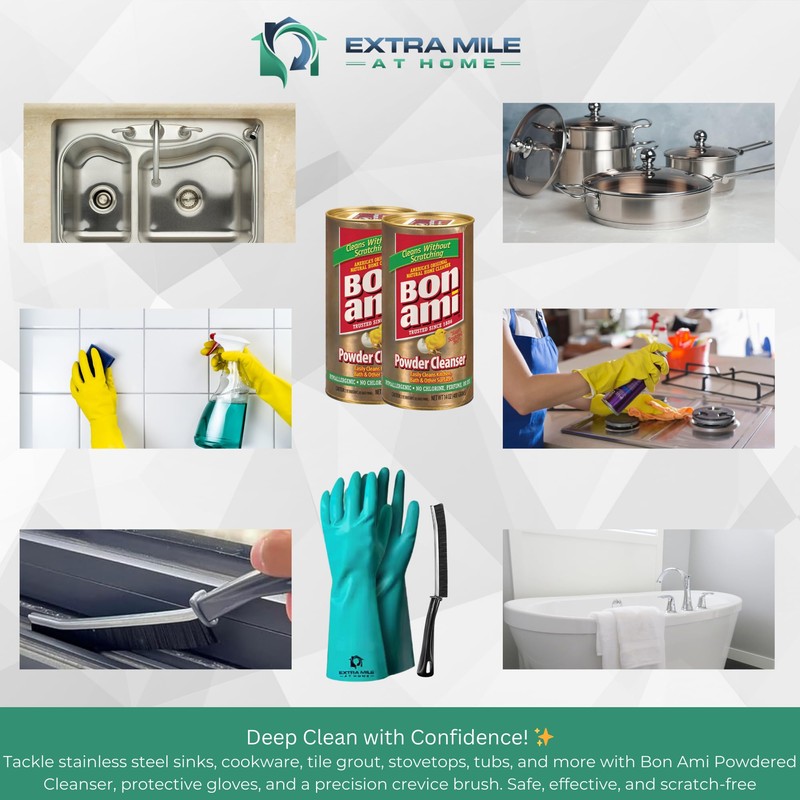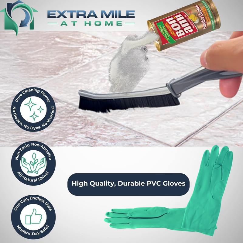 - All-in-One Deep Cleaning Bundle – This Extra Mile at Home cleaning kit includes a durable crevice brush, heavy-duty gloves, and two 14oz cans of non-abrasive powder cleanser—the perfect combination for tackling dirt, grime, and stains in every corner of your home. Whether you're scrubbing kitchen sinks, bathroom tubs, tile grout, or window tracks, this bundle helps restore surfaces to their original shine and spotless cleanliness with ease.