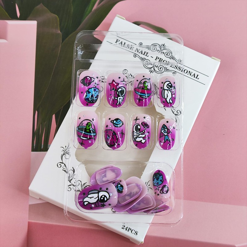 Extra Short Press on Nails Purple Fake Nails with Astronaut Spaceship Planet ...