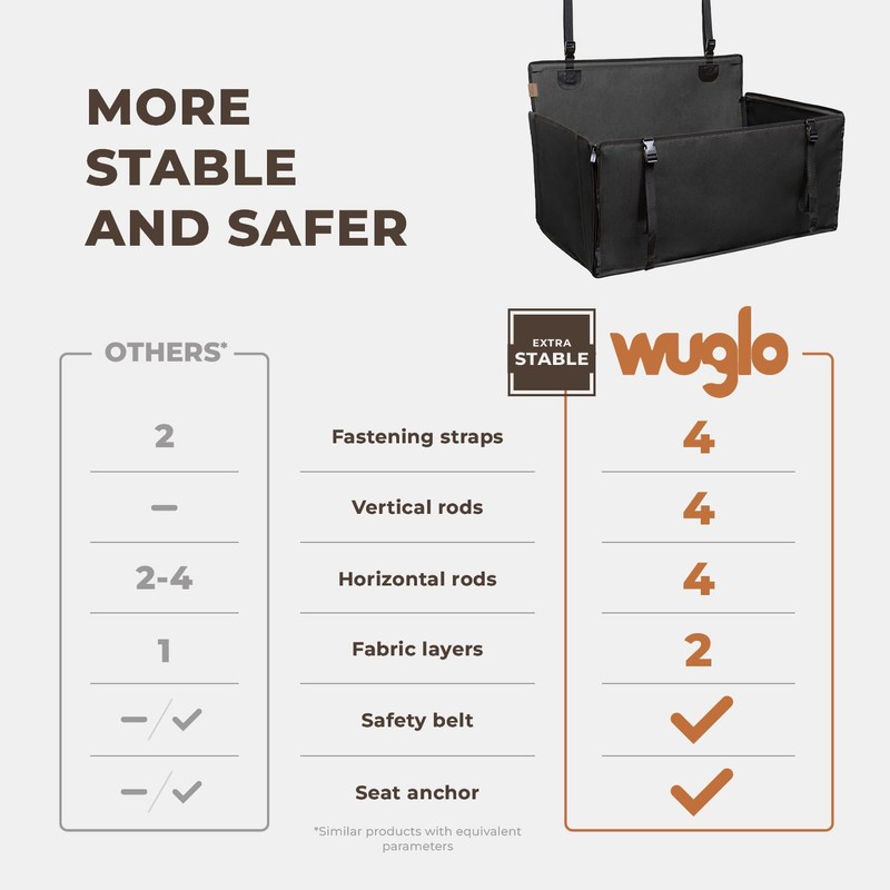 - Quickly Ready for Use- Due to their straightforward and user-friendly design, Wuglo dog car seats can be installed in just a few moments. Our dog car carrier can be conveniently attached to the back seat and the bars can be easily removed!