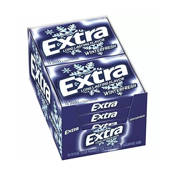 Product Description Wrigley's Extra Winterfresh Gum, 10 packs per box, 15 sticks per pack, 150 sticks total. Give Extra, get extra. Extra knows that when you give a little more, you get more in return. That's why there are more ways to share a moment in every pack. So give a piece to friends, family, or someone new. It might seem like something little, but sometimes the little things last the longest. Extra sugar-free chewing gum: celebrating life's meaningful connections, one piece at a time. Winterfresh Flavor - A nice, cool blast of blizzard-friendly mint. Enjoy icy-cold breath that cools you down year-round. Give Extra, get extra From the Manufacturer Made of: Sorbitol, Gum Base, Glycerol, Natural and Artificial Flavors, Hydrogenated Starch Hydrolysate; less than 2% of: Mannitol, Aspartame, Aspartame-Acesulfame, Colors (Blue 1 Lake, Titanium Dioxide), Acesulfame K, BHT (to maintain freshness), Soy Lecithin. Manufacturer Contact Information WM. Wrigley Jr. Company, Chicago, IL 60642