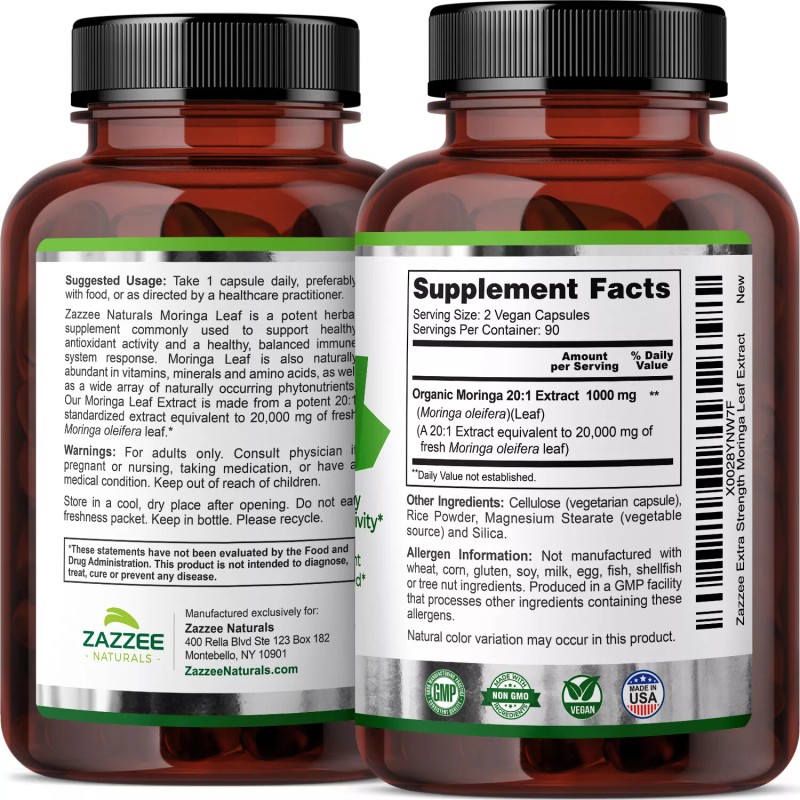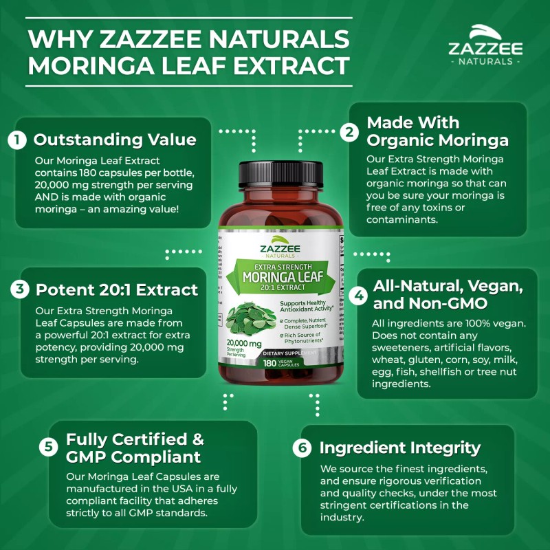 Extracto de Moringa Orgánica Zazzee 20:1, 20.000 mg Fuerza, 180 Cápsulas, 100% Puro-