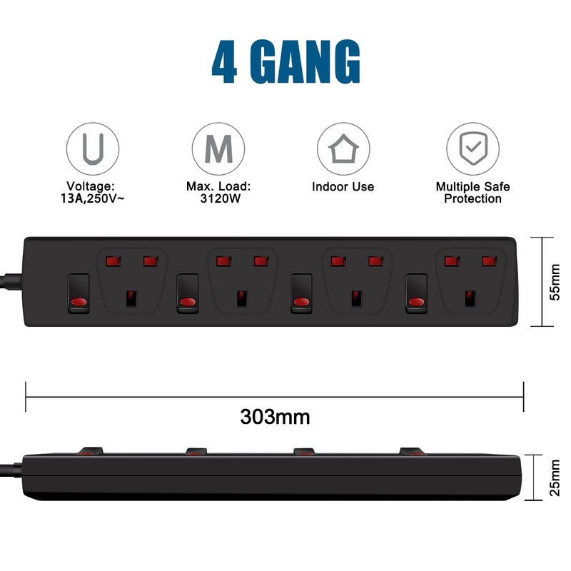 - Individual Switch Control: 4 individual switch allows to control 4 AC outlets and the neon indicator notifies you that your extension lead has been powered on and is ready for you to use. You only need to turn off the switch which you don’t need to use to control the appliances connected when you leave the house.