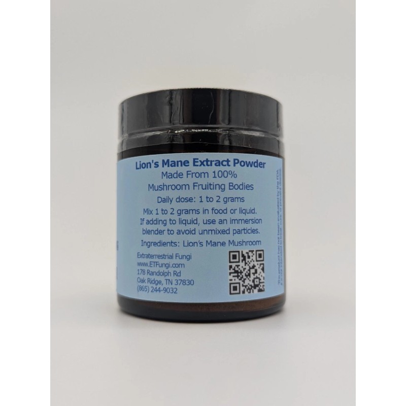 Lion's Mane Extract Powder, 60 g Extraterrestrial Fungi's popular organic Lion's Mane Extract Powder makes it easy to mix with your coffee or smoothie. Each capful contains 1000mg of pure Lion’s Mane fruiting body. Lion's Mane Benefits: Neuroprotective and regenerative such as nerve regeneration and accelerated motor recovery Inflammation management Improves oxidative stress markers and dopaminergic neuron health indicated in Parkinson's disease. Reduced amyloid plaques, better memory, and increased NGF in the hippocampus indicated in Alzheimer's disease. Fortifies spleen, supports digestion, treats gastric/duodenal ulcers and chronic gastritis Help alleviate Anxiety/depression in menopausal women May reduce insomnia and fatigue The extract is made with 100% organic Lion’s Mane fruiting bodies that are grown at a local farm in TN. Subcritical water extraction is used to unlock beneficial compounds, before dehydrating and powdering. Maintaining the entire fruiting body makes this product a great addition for those looking to improve gut health as well as brain function. Lion's Mane Extract Stack for Brain Health: Cognitex® Elite Pregnenolone Neuro-Mag® Magnesium L-Threonate These statements have not been evaluated by the Food and Drug Administration.These products are not intended to diagnose, treat, cure, or prevent any disease. Supplement Facts Ingredients: 1000mg organic pure Lion's Mane fruiting body per capful Daily dose: 1-2 capfuls. (Each cap is about 1 gram.) Recommended dose to recipe: 1 capful to 24 oz smoothie or coffee drink with milk 2 capfuls to cookie mix serving 24 pieces. - Made In USA at a local farm in TNLion's Mane Extract Powder ET Fungi