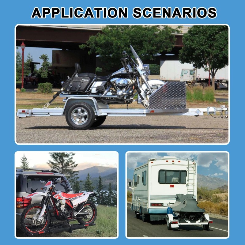 WIDE APPLICATION. The motorcycle straps are suitable for securing motorcycle, dirt bikes, truck, ATV, cargoes, etc. .They can adaptable for various tie-down scenarios and easily accommodates different attachment points