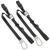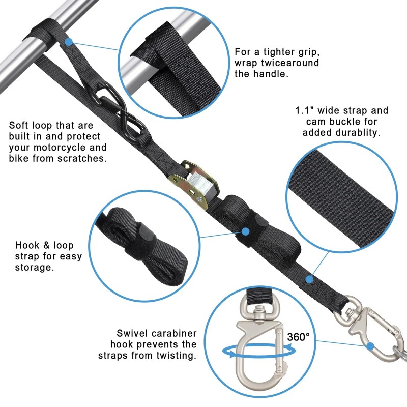 UPGRADED SWIVEL CARABINER HOOK. Each motorcycle tie down strap has a swivel carabiner hook on one end. The swivel carabiner hook can be rotated 360° to prevent twisting of the strap