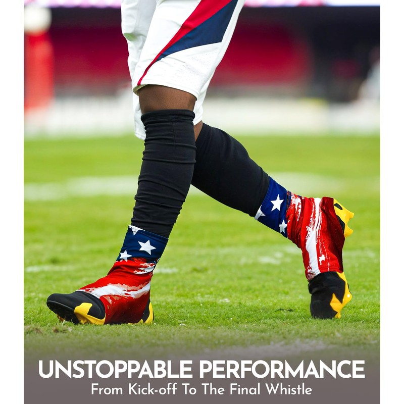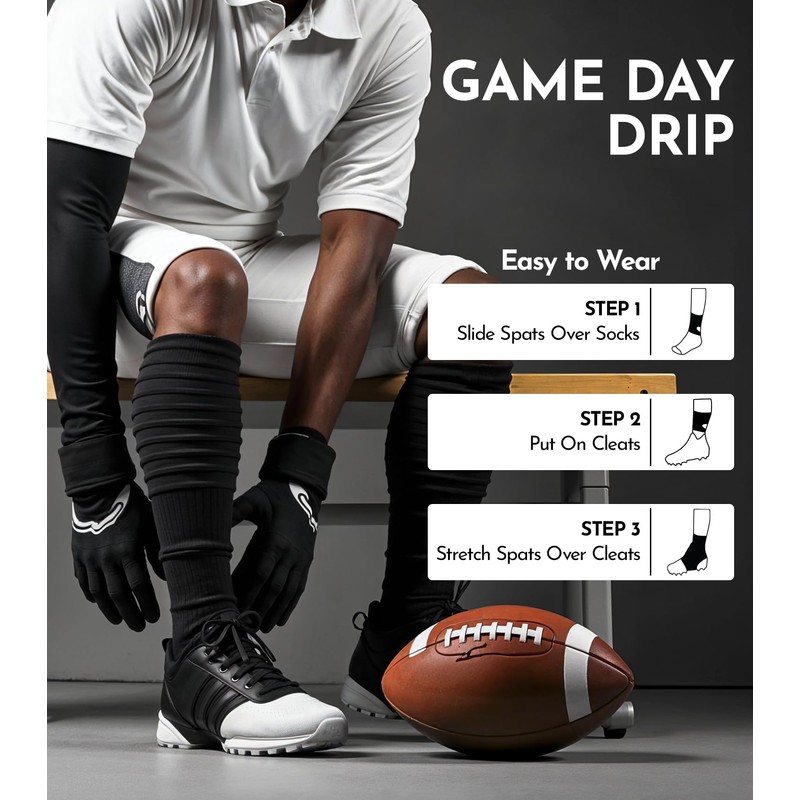 - STRETCHES OVER YOUR CLEATS WITH EASE: Made from a premium blend of 90% polyester and 10% spandex with 4-way stretch compression fabric, these cleat spats football are lightweight and flexible. They stretch comfortably over your shoes without losing their shape.