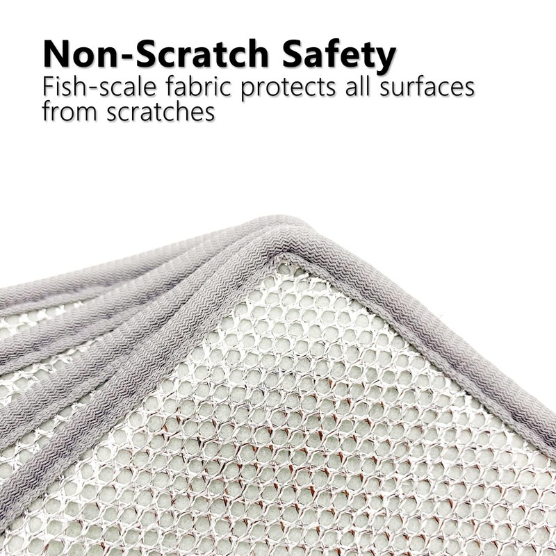 - Non-Scratch Cleaning for All Surfaces The fish-scale grid fabric design makes these rags safe for use on all kitchen surfaces. Clean dishes, pots, pans, countertops, and cooktops without scratching or damaging your cookware.