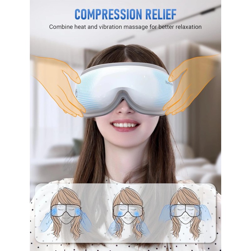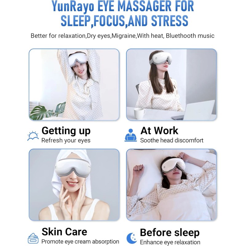 - 1. YunRayo eye massager integrates fatigue relief and beauty care in one device. It features heating and air-pressure functions that stimulate pressure points around the eyes, helping to relieve migraines, promote eye-area blood circulation, alleviate dryness and fatigue, reduce dark circles, and brighten the skin around the eyes. It is suitable for students, office workers, and elders for daily care, bringing health and comfort into every gentle moment of life.