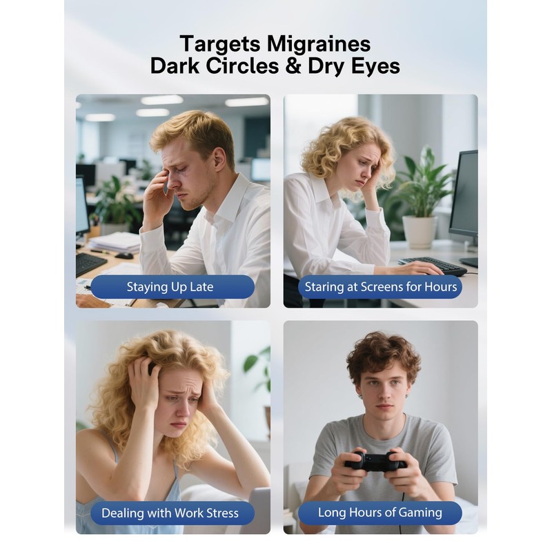 - Full Eye & Temple Massage for Daily Relief - This eye massager simulates real massage techniques to target the eyes and temples, helping reduce fatigue. Perfect for relaxation after a long screen time or a stressful day.