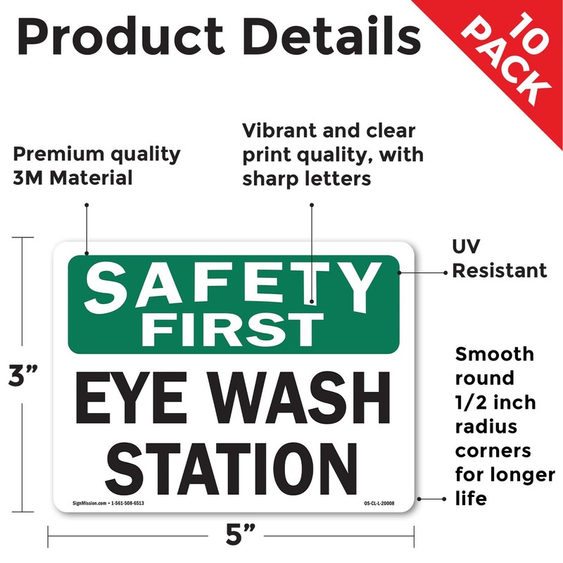 Eye Wash Station OSHA Safety First Vinyl Decal Label 5 Inch x 3.5 Inch - 10 Pack