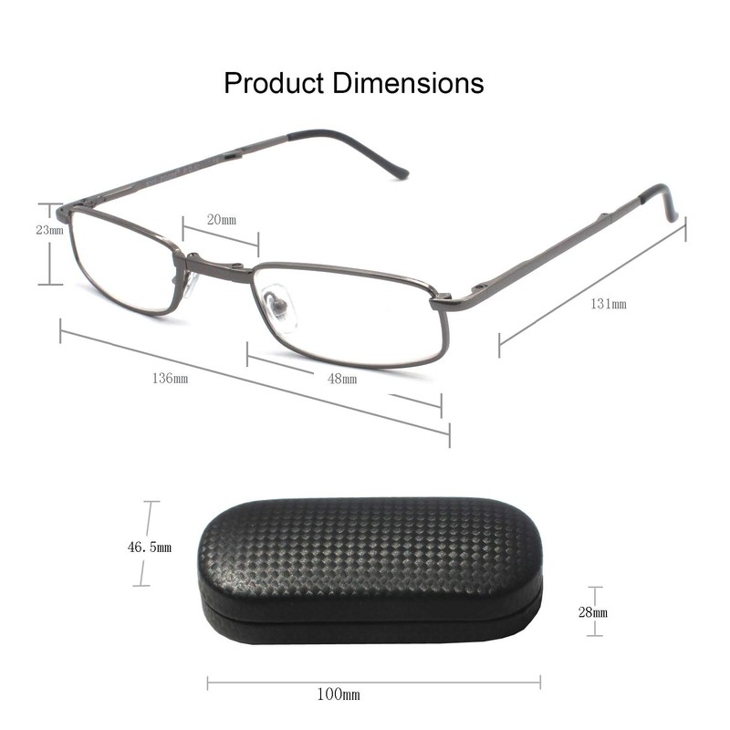 - EYE ZOOM unisex folding reading glasses easy to carry and use. Classic rectangular shaped frames, look good on any face. Spring-hinged temples, help glasses fit your face. Great for home, office, or bed side use. Keep a pair at your desk, in your bag, and in your favorite reading spots.