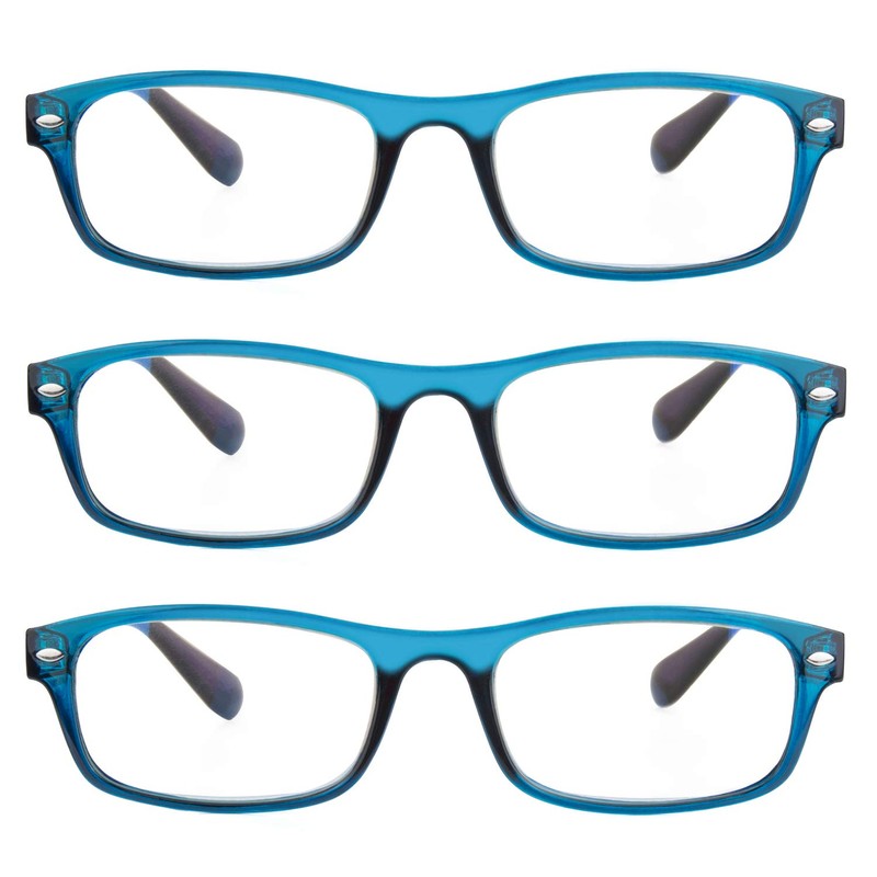 EYE ZOOM 3 Pack Rectangular Plastic Frame Blue Light Blocking and Anti UV Reading glasses, Blue, +1.50