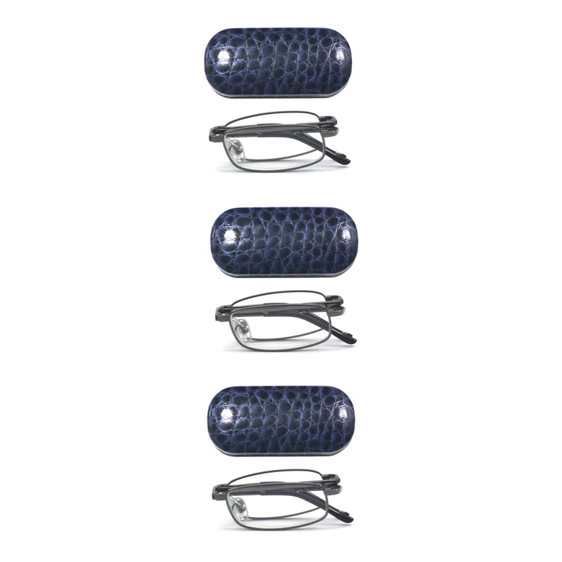 EYE ZOOM 3 Pack Unisex Compact Metal Rectangular Folding Reading Glasses with Case, Navy Blue Case and Gunmetal Frame, +3.00
