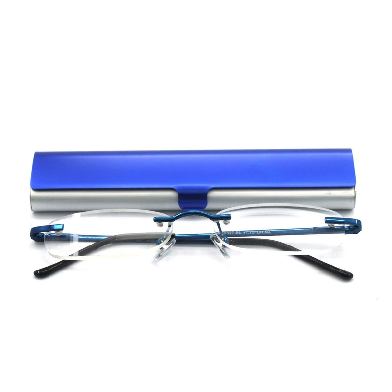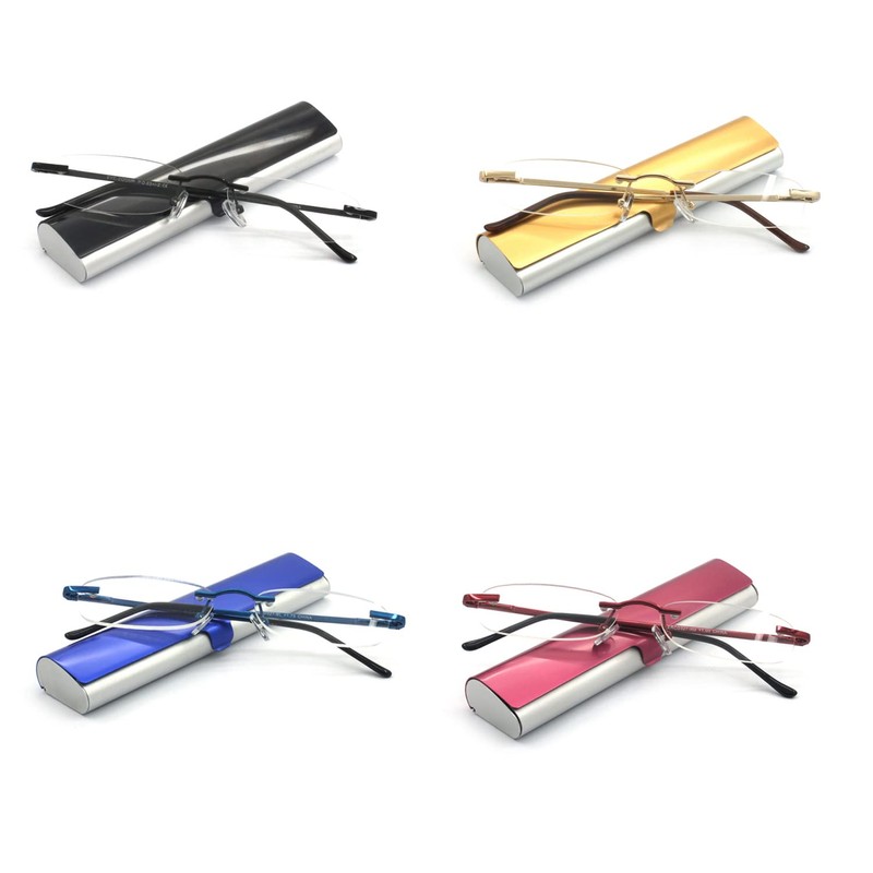 - EYE ZOOM Slim metal rimless reading glasses with super lightweight aluminum case. Compact rimless portable readers easy to carry and use. Classic-shaped look good on any face. Spring-hinged temples, help glasses fit your face.