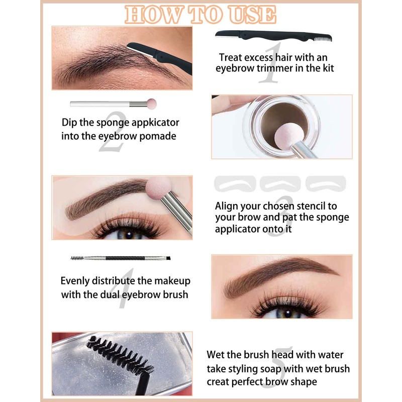 - EYEBROW MAKEUP KIT- Each set includes brow pomade, 10 brow stencils, sponge applicator, dual-ended angled brow brush, eyebrow trimmer, eyebrow setting gel. Allows you to quickly create a natural perfect brow shape even on the busiest morning