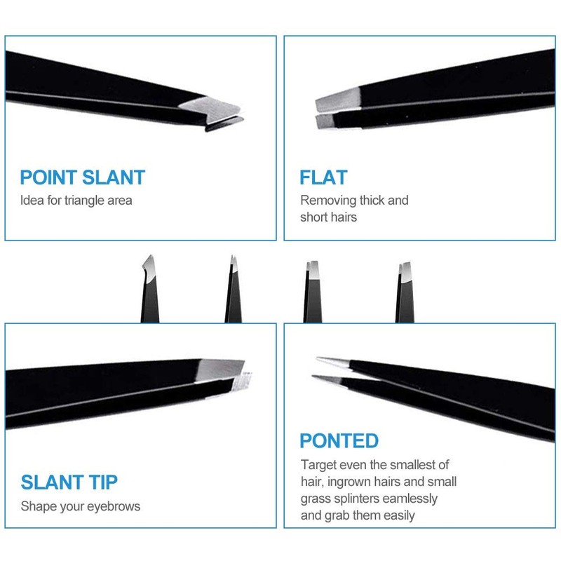 - 4 different tweezers: 4 different eyebrow precision tweezers are included in this set, from oblique tweezers, pointed tweezers, pointed tweezers, flat tweezers. They can not only be used for eyebrow shaping, odd stray hair/chin hair, remove ingrown hairs/splinters/ticks, but also for false eyelashes and double eyelid attachment, also used for crafts, jewellery making, laboratory work, etc.