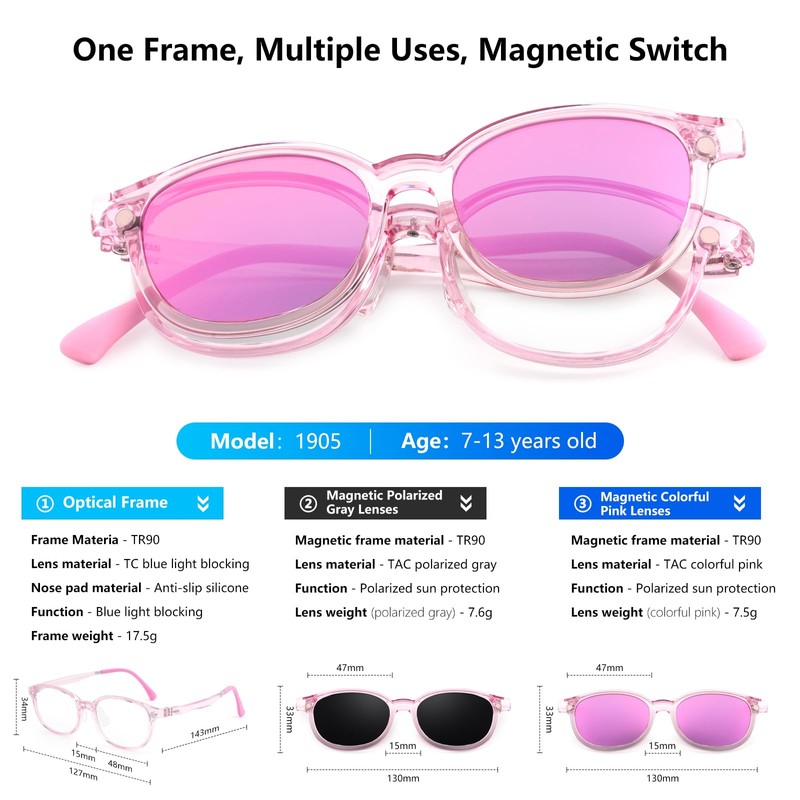 - [UV Protection]: This magnetic clip-on eyewear comes with two high-quality sunglasses lenses, allowing children to switch between polarized and colorful lenses based on their mood. It provides 100% UV protection, ensuring their eyes are shielded from harmful sunlight during outdoor activities