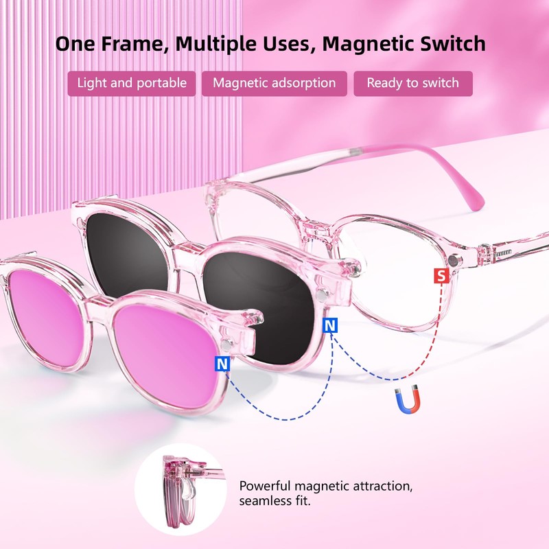 - [Safe & Durable]: The magnetic sunglasses for eyeglasses are made from high-quality materials, attaching quickly and securely to the glasses to reduce the risk of falling off during activities. The lenses are scratch-resistant and impact-resistant, able to withstand the wear and tear of children's daily activities