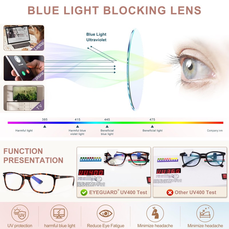 - [Blue Light Blocker & UV400 Lens]-The blue light blocking reading glasses can filter harmful blue ray and have 100% UV protection. It's suitable for reading, watching TV, PC or smartphones , meanwhilely reduce eyestrain, eye fatigue and let you have a better sleep.
