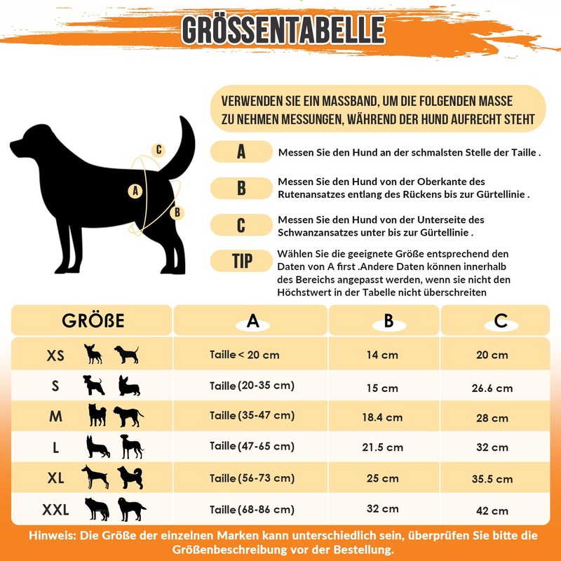 - Available in various sizes --- Eyein dog nappies are available in different sizes for dogs of all ages and sizes. Please measure your dog's waist directly in front of the hind legs before ordering for a better fit. Of course, you can send us your dog's size information for support, and we will be happy to help you choose the right size.