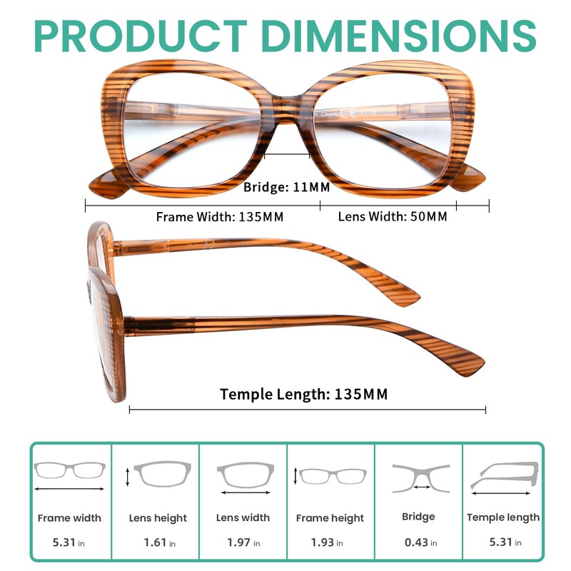 - PRODUCTS DIMENSION - Frame Material is Plastic,Lens width about 2 inches(50mm),Frame width about 5 5/16 inches(135mm),Lens height about 1 5/8 inches(41mm),Frame height about 1 15/16 inches(49mm), Bridge(DBL) about 7/16 inches(11mm), Temple length about 5 5/16 inches(135mm),with spring hinge