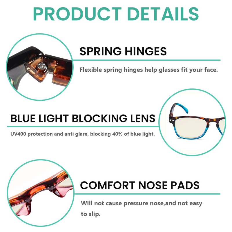 - The blue light blocker specs with spring hinges are durable and comfortable to wear for a long time. The tortoise frame eyewear keeps you looking stylish while working or playing.