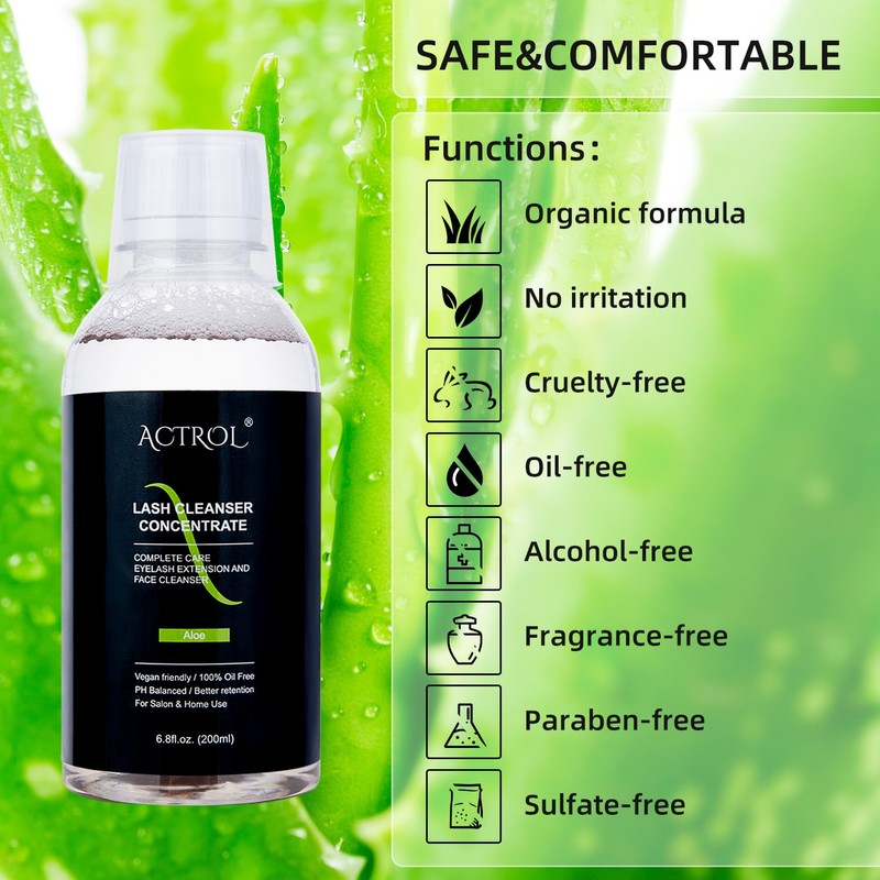 Eyelash Cleanser Concentrate Aloe 200ml Professional Lash Extensions Shampoo Natural Foaming Cleanser DIY Paraben & Sulfate Free Non-lrritating Wash for Extensions Lashes with Salon Home Care-Makes 60ml Bottles Eyelash Shampoo