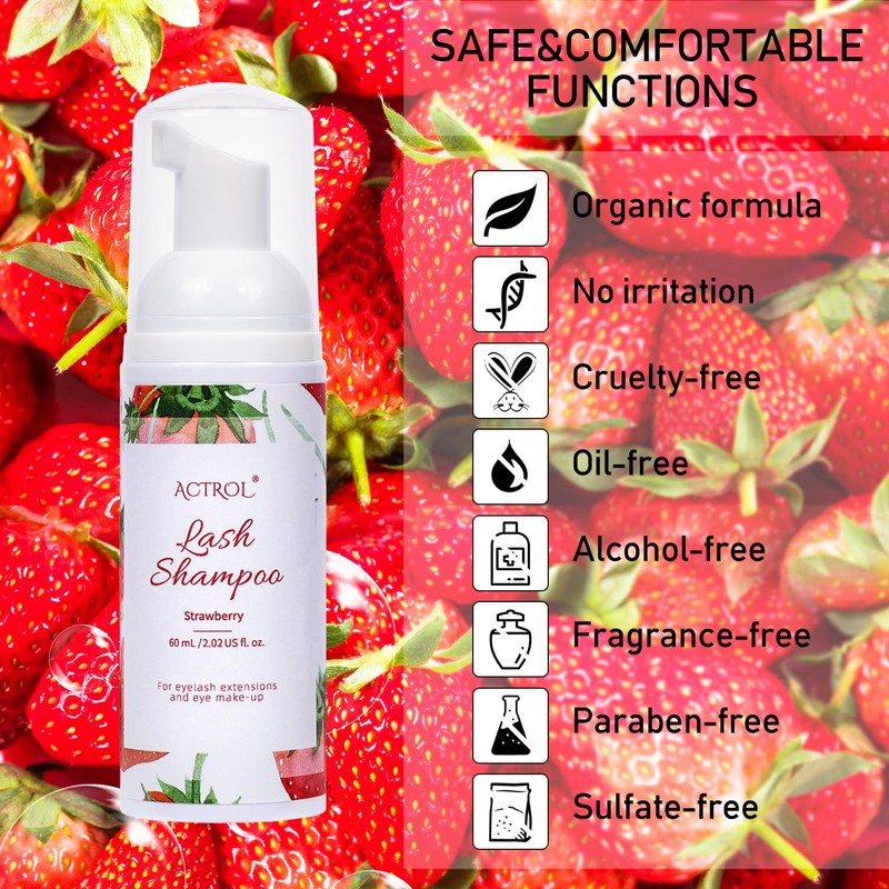 Eyelash Extension Cleanser 60ML Natural Lash Extension Shampoo Strawberry Professional Eyelid Foaming Cleanser Paraben & Sulfate Free Non-lrritating with Salon and Home Care