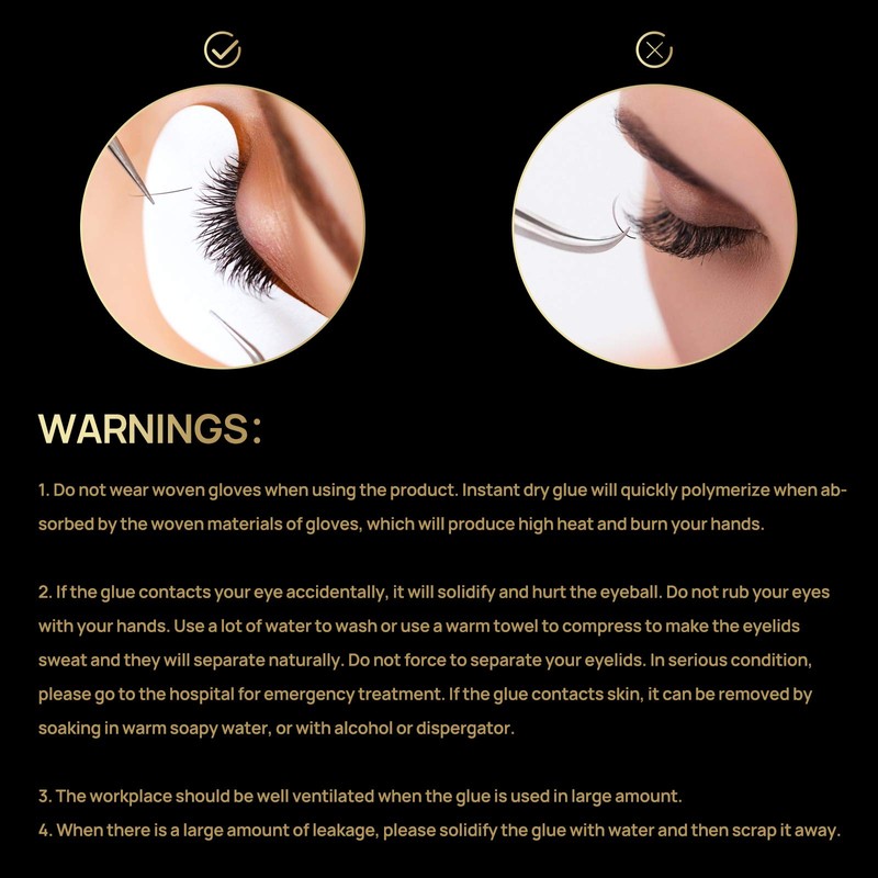 - WARNING: DO NOT USE THE PRODUCT FOR SELF-APPLICATION, THIS MAY CAUSE EYE IRRITATION OR BURNING. ONLY FOR PROFESSIONAL (SALON) USE BY LASH PROFESSIONALS ADEQUATELY TRAINED TO DO SEMI-PERMANENT INDIVIDUAL EYELASH EXTENSIONS (NOT CLUSTER OR STRIP LASHES). USE WITH CLUSTER OR STRIP LASHES IS PROHIBITED. We are not responsible for the misuse of the product.