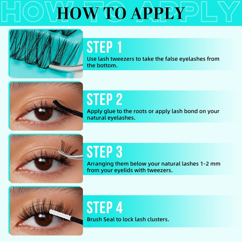 - Easy to use: curl your eyelashes first, apply glue to the roots or apply lash bond to your natural eyelashes. Use eyelash tweezers to take the false eyelashes from below. Arrange them under your natural eyelashes 1-2 mm away from your eyelids, finally use an eyelash sealing brush to seal them. Through 3 steps - glue, apply, seal 11 - can every every Achieve results.