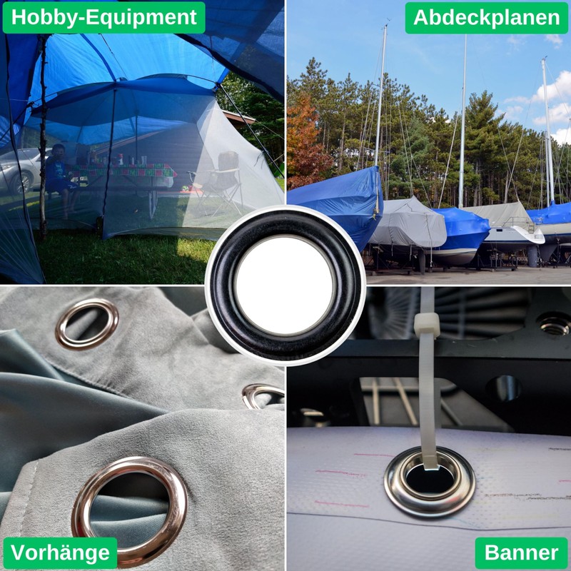 - Grommet eyelets and discs made of rust-free metal: the eyelets and washers can be used indoors and outdoors - e.g. for outdoor clothing or tarpaulins in the garden.