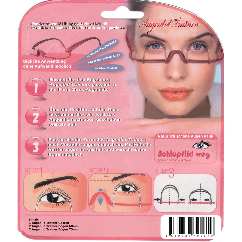 - Contents: 1 eyelid trainer, 2 eyelid trainer bows 68 mm, 2 eyelid trainer bows 73 mm.