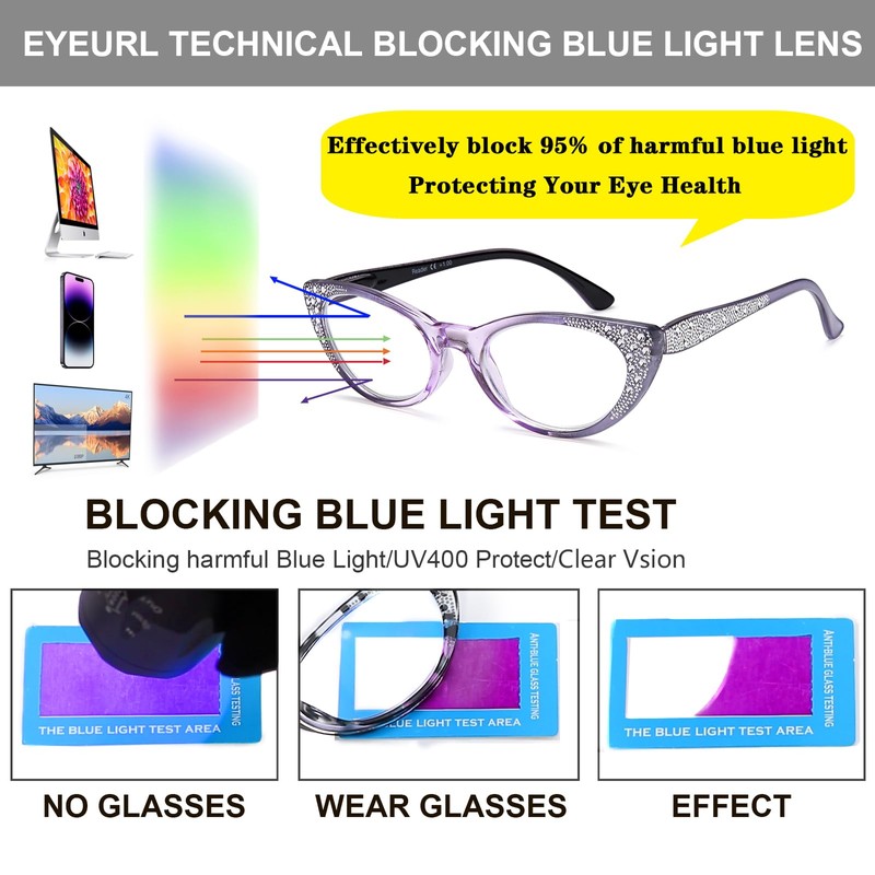 - ✔【Blocking Harmful Blue Light Glasses】EYEURL blue light blocking cat eye reading glasses women can filter harmful blue light & UV400 rays. After using blue light blocker readers,make you reduce eye fatigue, glare, blurred vision and headache from reading, ipads, gaming, computer or phone.