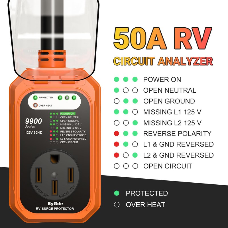 EyGde RV Surge Protector 50 Amp Waterproof, RV Circuit Analyzer with Full Ele...