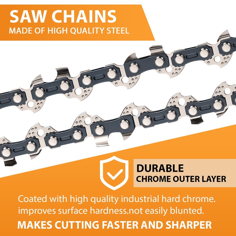- đȘăReliable Qualityă1. Material: imported steel, high toughness, anti-fracture. 2. Connection: Heat treated and quenched rivets to ensure smooth cutting and optimal lubrication. 3. Surface: All the chain cutters are plated with premium industrial hard chrome, of better wear resistance. This saw chain met the kickback performance requirements of ANSl B175.1-2012 when tested according to the provisions of ANSl B175.1-2012. Low kickback saw chain meets the kickback performance requirements of CSA Standard Z62.3.
